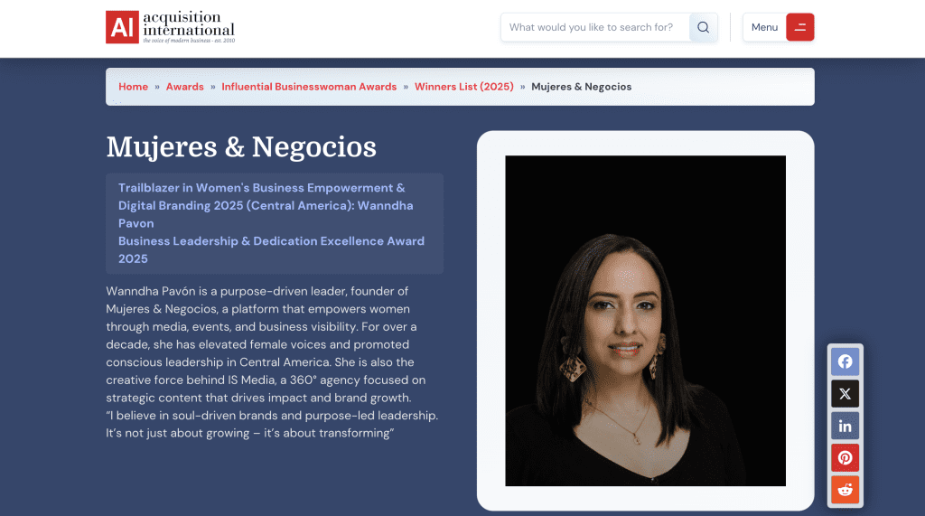 Finalmente, agradecemos profundamente a Acquisition International por tenernos en su radar y por creer en el poder, la voz y el impacto de Mujeres & Negocios. Este reconocimiento impulsa nuestro compromiso de seguir construyendo espacios de transformación, inspiración y liderazgo femenino en nuestra región y más allá.